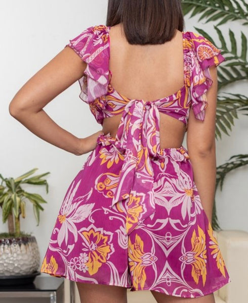 backless romper features a sweetheart neck, ruffled shoulder, cap sleeve, ruffled body detail, back tie, romper hem and all over print.
